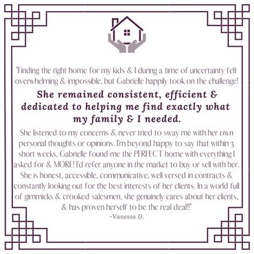 "Finding the right home for my kids & I during uncertainty (COVID Pandemic) felt overwhelming & impossible, but Gabrielle happily took on the challenge! She remained consisten, efficient & dedicated to helping me find exactly what my family & I needed. She listened to my concerns and never tried to sway me with her own personal thoughts or opinions. I am beyond happy to say tht within 3 short weeks, Gabrielle found me the PERFECT home with everything I asked for and MORE! I'd refer anyone in the market to buy or sell with her! She is honest, accessible, communicative, well versed in contracts and constantly looking out for the best interests of her clients. In a world full of gimmicks and crooked salesmen, she genuninely cares about her cleitns, and has proven herself to be the real deal!!"