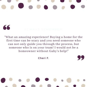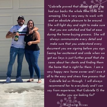 "Working with Gaby has made our journey very calm and easy. She let us know in the beginning waht to expect. Even when we came to a bump in the road she made us feel at ease and kept lifting our spirits! She explained everything so well to our understanding. Giving us the best of the best!! My family and I are very thrilled to start our journey together in our first home! Thank you SO much Gabrielle for letting us have this opportunity to work with you and helping us find our DREAM home!! We appreciate you SO much!!"